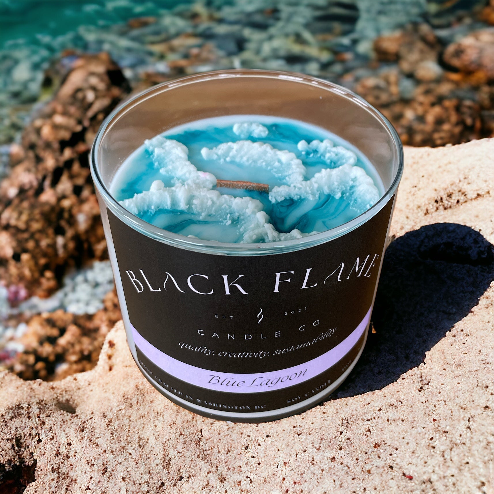 Indulge in a sensory escape with Blue Lagoon - With every light of this candle, you'll be transported to a tranquil and peaceful beachfront setting. The unique blend of himalayan salt and driftwood perfectly balances the floral notes of jasmine and blue lotus to create an unforgettable experience."
