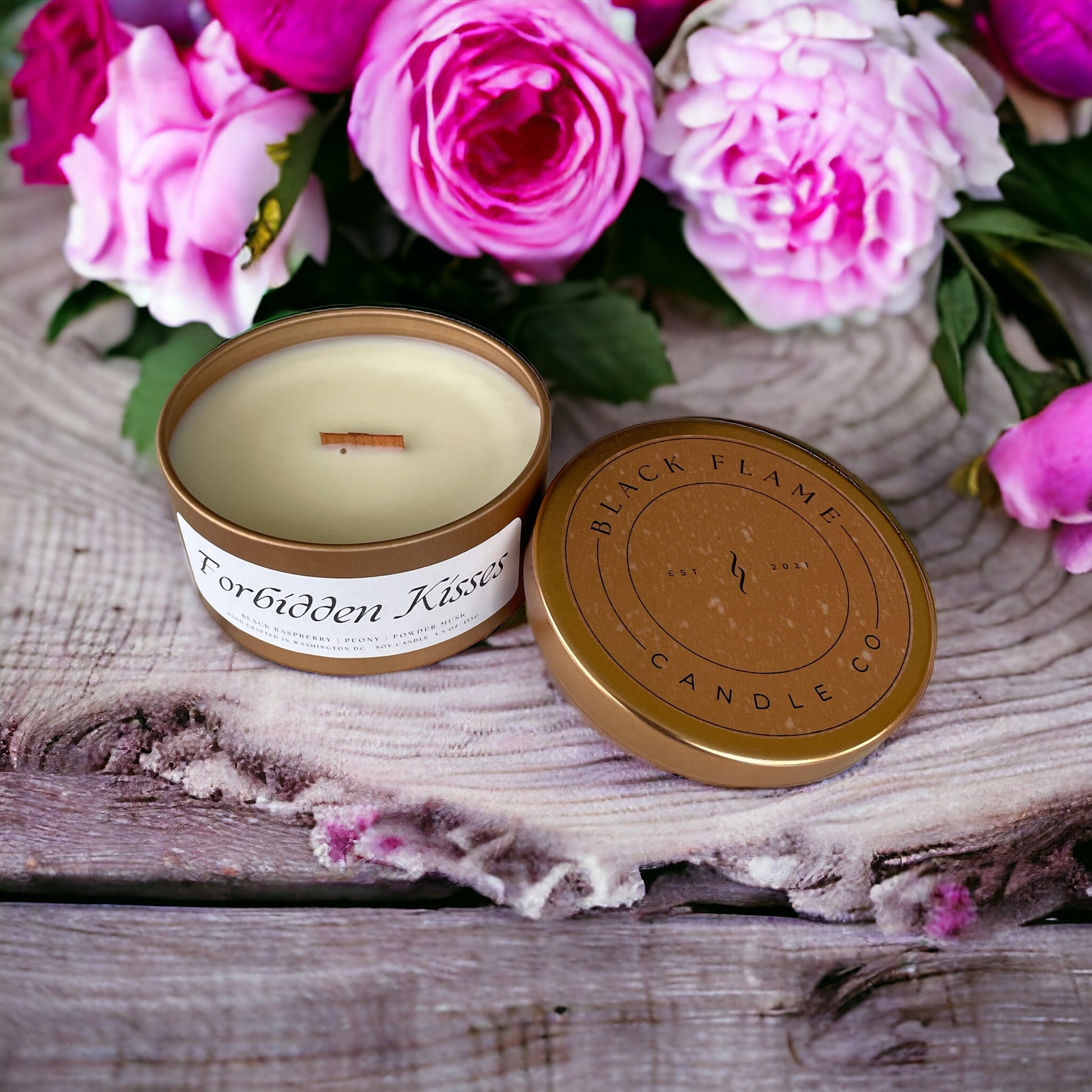 Indulge in the forbidden with our FORBIDDEN KISSES. This sophisticated blend of black raspberry, rose petals, and vanilla bean will leave you craving more. With sweet sugar and soft peony notes, this scent is irresistible and perfect for a playful night out. Join the dark side and embrace the forbidden.